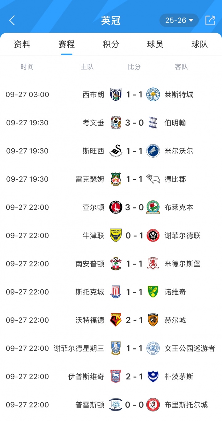 09月28日訊 英冠昨日第七輪比賽全部結束。
