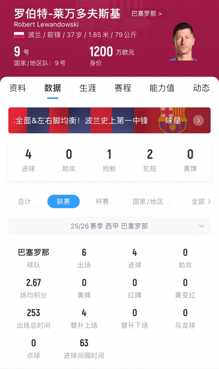 萊萬(wàn)現年37歲,他本賽季至今為巴薩出戰6場(chǎng)西甲,打進(jìn)4球,現身價(jià)1200萬(wàn)歐,他與巴薩的合同將于明年到期。