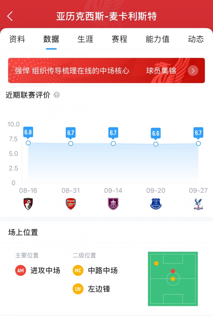 麥卡利斯特本賽季開(kāi)賽后,表現平平。目前2個(gè)月來(lái)的英超比賽以及兩場(chǎng)歐冠比賽沒(méi)有一場(chǎng)媒體評分達到7分。