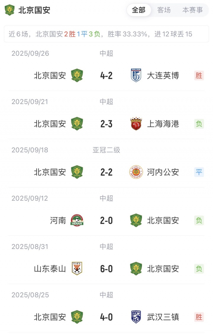 國安與麥克阿瑟此前還未交手過(guò),雙方近6場(chǎng)比賽戰績(jì)如下: