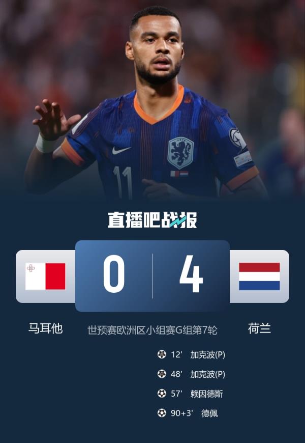 上半場(chǎng)赫拉芬貝赫造點(diǎn),加克波點(diǎn)射閃擊得手,下半場(chǎng)加克波點(diǎn)射完成雙響,賴(lài)因德斯推射擴大比分,德佩替補建功,最終荷蘭4-0馬耳他三分領(lǐng)跑。